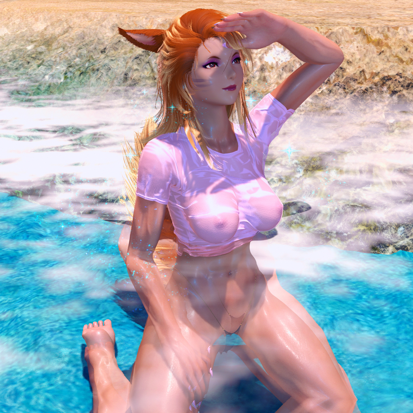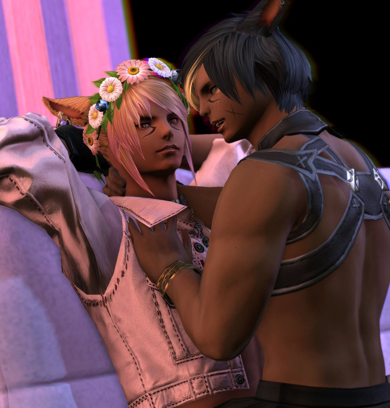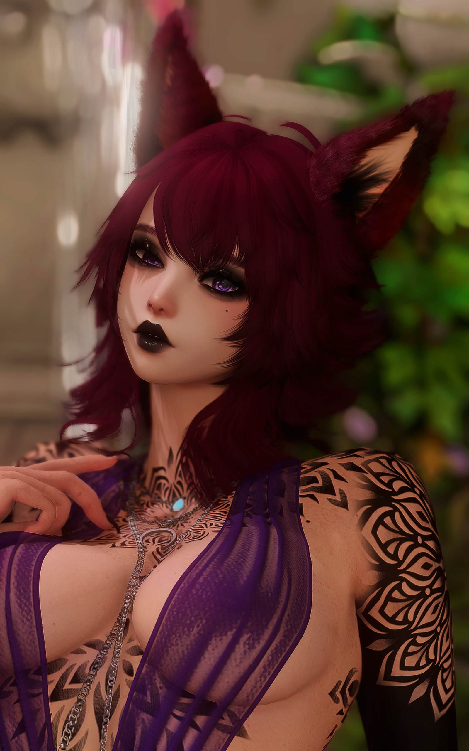 Bio: Sun-kissed Miqo'te with a mysterious past, he grew up with a ragtag group of found family members and embraced the art of pleasuring others in many ways which brought him joy. Romantic, emotional, and adventurous; he holds an optimistic look to life in most aspects.
